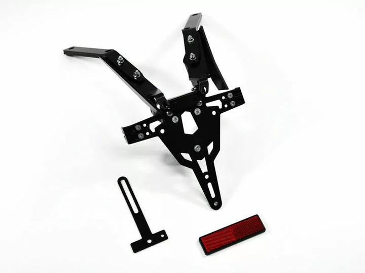 De kentekenplaathouder is extreem duurzaam en weerbestendig., Zwart poeder bedekt. , De kentekenplaathouder kan worden gebruikt voor elke soort kenteken (175 mm breedte)., Geen wijziging van de vereiste kuip., Stepless aanpassing van de harkhoek., Indicatorondersteuning in 3 posities. Plaat., Speciale indicatorlichtmounts (afzonderlijk verkocht) vereist voor stockindicatorlichten., Kit omvat: 1 kentekenplaathouder incl. Montagekit., LED -kentekenlampje "e goedgekeurd" incl. Ondersteuning., Licht terug met ondersteuning.