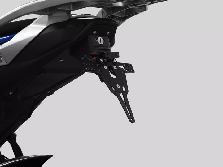 De kentekenplaathouder is extreem duurzaam en weerbestendig., Zwart poeder bedekt. , De kentekenplaathouder kan worden gebruikt voor elke soort kenteken (175 mm breedte)., Geen wijziging van de vereiste kuip., Stepless aanpassing van de harkhoek., Indicatorondersteuning in 3 posities. Plaat., Speciale indicatorlichtmounts (afzonderlijk verkocht) vereist voor stockindicatorlichten., Kit omvat: 1 kentekenplaathouder incl. Montagekit., LED -kentekenlampje "e goedgekeurd" incl. Ondersteuning., Licht terug met ondersteuning.